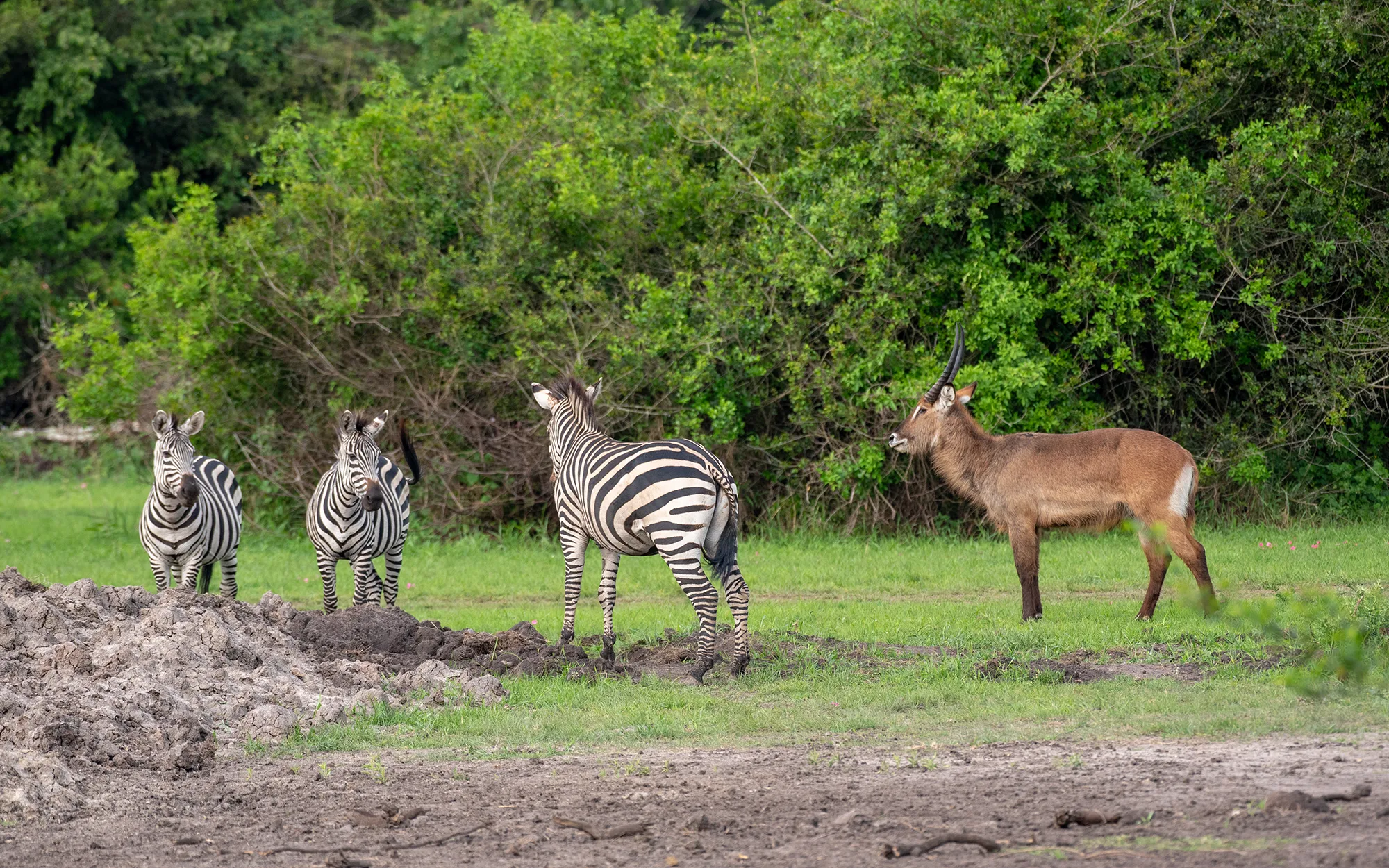 Zebras and defasa waterbucks in Lake Mburo National Park